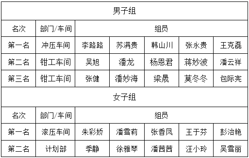 通過每次的消防演練及消防知識的培訓(xùn),不僅進(jìn)一步增強(qiáng)了廣大員工的防范意識和自救能力,了解和掌握如何識別危險、如何采取必要的應(yīng)急措施等基本操作,以便在事故中達(dá)到快速、有序、及時、有效的效果。同時為了鼓勵廣大員工能更踴躍的融入到消防演練的集體中,在此次演練評選出男子組前三名、女子組前兩名,并頒發(fā)了獎狀及獎金,以資鼓勵。獲獎名單如下: