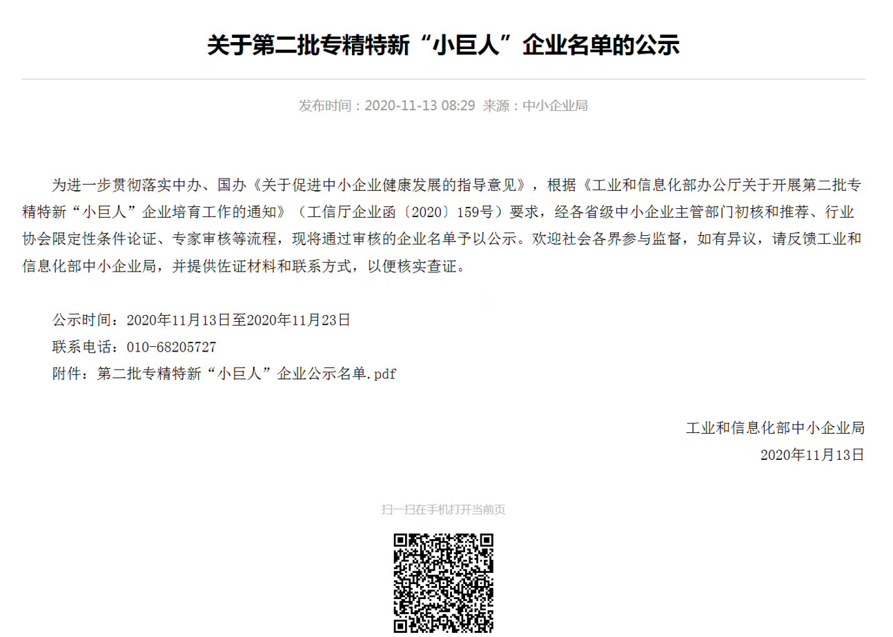 根據《關于組織推薦第二批國家級專精特新“小巨人”企業》文件通知要求,我司通過地方經信推薦,符合申報要求,積極準備相關資料上報,經各地經信部門初審、市級相關部門會審以及省級專家評審,我司順利通過評審,成功入選“國家級專精特新“小巨人”名單,取得國家級榮譽,并在工信部平臺上予以公布。