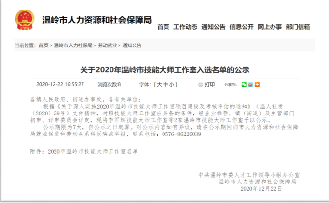 我司根據《關于深入實施2020年度溫嶺市技能大師工作室項目建設及考核評估的通知》(溫人社發〔2020〕59號)文件精神,通過自行推薦以及地方政府的大力支持,充分準備了相關申報資料,通過主管部門的初審以及專家的評審、部門審議和社會公示等評選環節,我司最終順利通過評審,被評定為“李軍輝技能大師工作室”并于政府平臺公示。